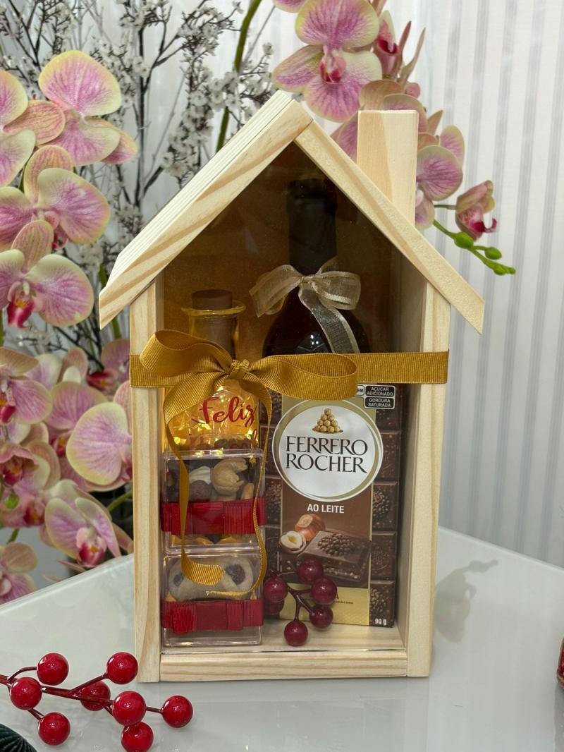 Um belo bau de madeira em formato de casinha, recheados de belissimos itens para presentear