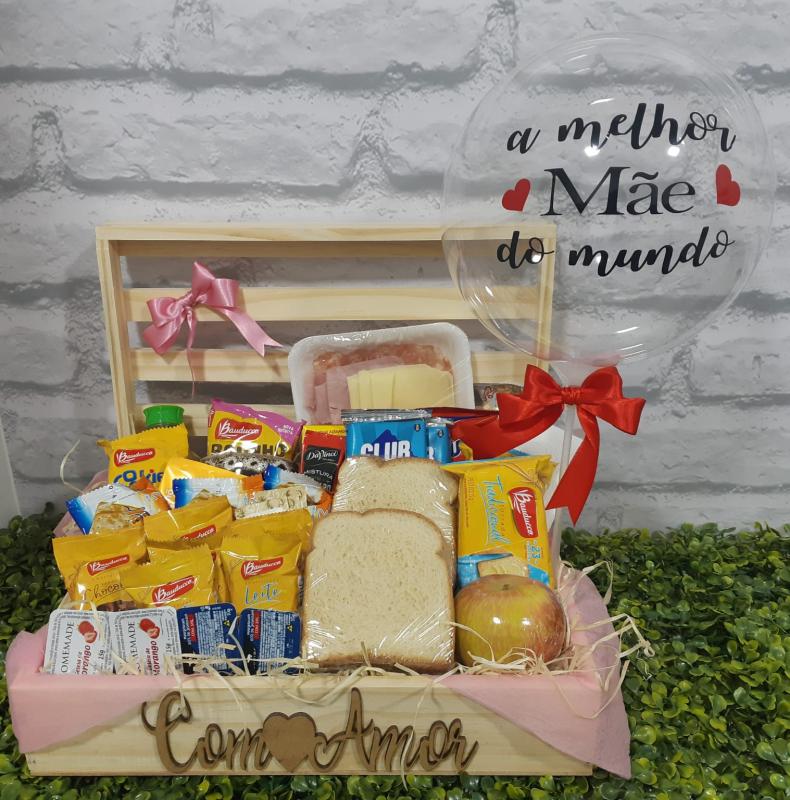 CESTA DE CAFÉ DA MANHÃ ADORO VOCÊ COM KIT + BALÃO DIA DAS MÃ   BALÃO BUBBLE PEQUENO FELIZ DIA DAS MÃES