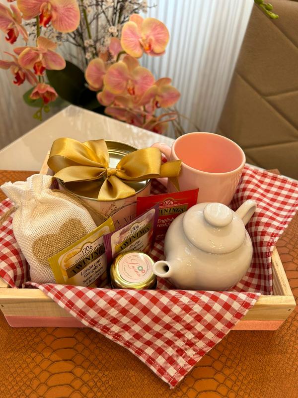 CESTA BOX TEA BREAK   BALÃO BUBBLE PEQUENO PARABENS PELO SEU DIA