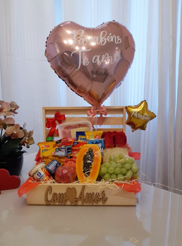 CESTA DE CAFÉ DE DIA DAS MÃES BATE CORAÇÃO   BALÃO BUBBLE GRANDE PERSONALIZADO