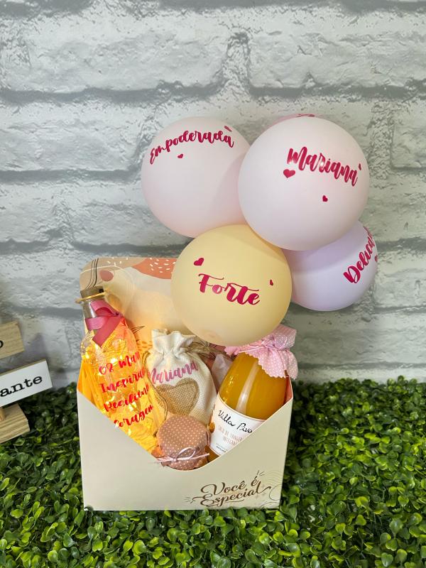 CESTA DE DIA DAS MULHERES BRILHA   BALÃO CORAÇÃO PERSONALIZADO TAMANHO 45CM