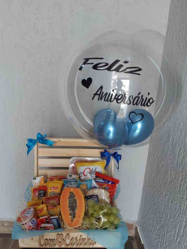 CESTA DE ANIVERSÁRIO SABOREANDO SEU NIVER   BALÃO BUBBLE MEDIO JUNTOS ATÉ O FIM