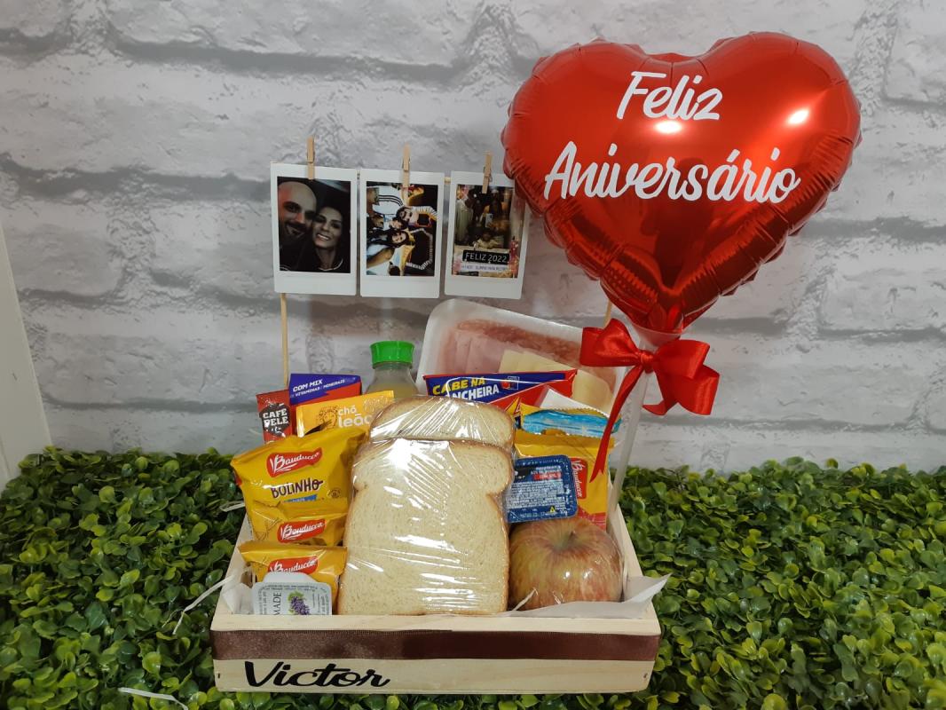 CESTA BOX DE CAFÉ DA MANHÃ COM BALÃO METALIZADO FELIZ ANIVER   BALÃO BUBBLE PEQUENO EU TE AMO