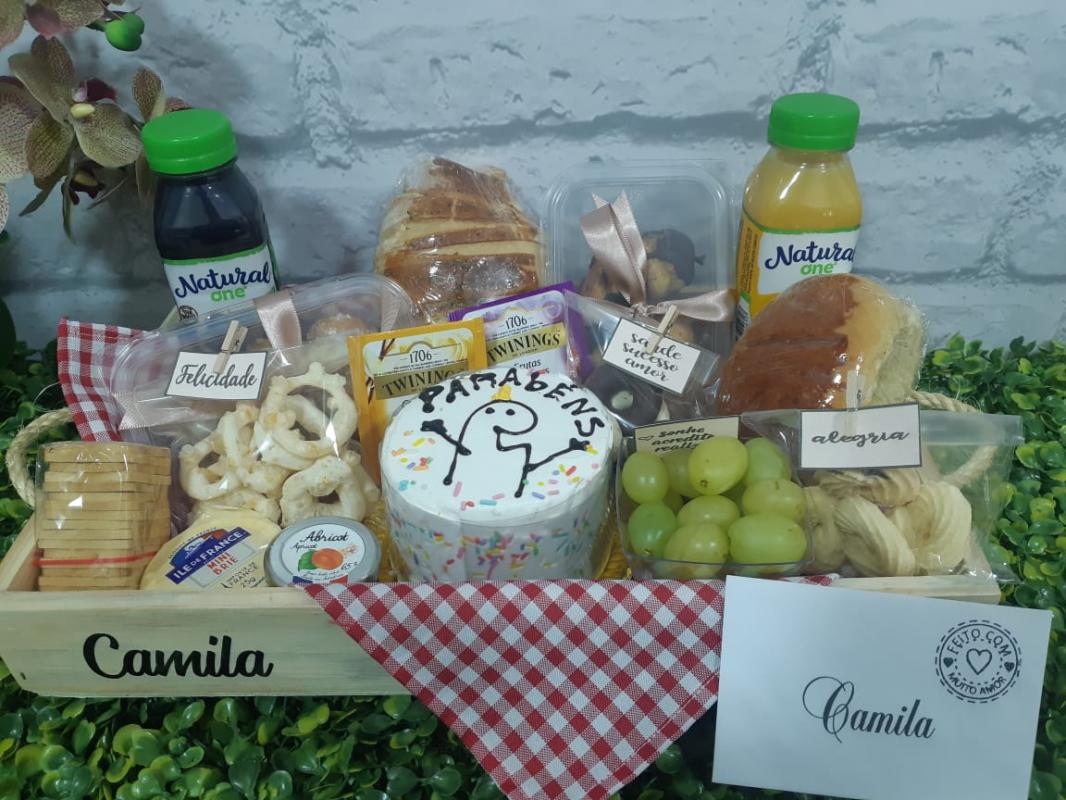 CESTA DE CAFÉ COM BOLO BENTO CAKE E ALEGRIA